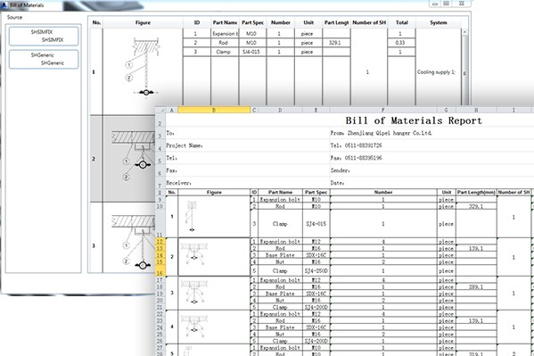 Detailed reports list detailed information for each support and hanger product and its constituent parts (including product code, material, bolts, nuts, and others). This report can be used to help assemble the suspension elements from parts on site.