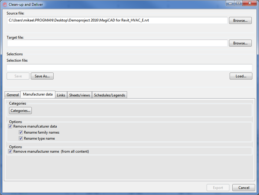 The Clean up and deliver tool removes all manufacturer-specific information from your project, as well as all MagiCAD data. This is particularly useful when it is time to deliver your Revit models to other stakeholders in a project.